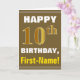 Este sencillo diseño de tarjetas de felicitación con temática de cumpleaños presenta un cálido deseo de cumpleaños como "¡FELIZ décimo cumpleaños, nombre!" en la parte delantera, en negrita con un fondo de color marrón. El número de cumpleaños tiene un aspecto de color falso/imitación dorado. El nombre en la parte delantera se puede personalizar. El interior incluye un mensaje de cumpleaños que se puede personalizar. Una tarjeta de felicitación como esta podría ser una manera divertida de entregar deseos de cumpleaños a alguien que está celebrando su décimo cumpleaños. [~Z0000281]