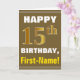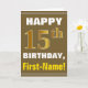 Este sencillo diseño de tarjetas de felicitación con temática de cumpleaños presenta un cálido deseo de cumpleaños como "¡FELIZ 15º CUMPLEAÑOS, nombre!" en la parte delantera, en negrita con un fondo de color marrón. El número de cumpleaños tiene un aspecto de color falso/imitación dorado. El nombre en la parte delantera se puede personalizar. El interior incluye un mensaje de cumpleaños que se puede personalizar. Una tarjeta de felicitación como esta podría ser una manera divertida de entregar deseos de cumpleaños a alguien que está celebrando su décimo quinto cumpleaños. [~Z0000281]