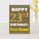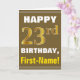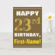 Este sencillo diseño de tarjetas de felicitación con temática de cumpleaños presenta un cálido deseo de cumpleaños como "¡FELIZ 23 cumpleaños, nombre!" en la parte delantera, en negrita con un fondo de color marrón. El número de cumpleaños tiene un aspecto de color falso/imitación dorado. El nombre en la parte delantera se puede personalizar. El interior incluye un mensaje de cumpleaños que se puede personalizar. Una tarjeta de felicitación como esta podría ser una manera divertida de entregar deseos de cumpleaños a alguien que está celebrando su vigésimo tercer cumpleaños. [~Z0000281]