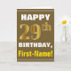 Este sencillo diseño de tarjetas de felicitación con temática de cumpleaños presenta un cálido deseo de cumpleaños como "¡FELIZ 29º CUMPLEAÑOS, nombre!" en la parte delantera, en negrita con un fondo de color marrón. El número de cumpleaños tiene un aspecto de color falso/imitación dorado. El nombre del frente puede ser personalizado. El interior incluye un mensaje de cumpleaños que se puede personalizar. Una tarjeta de felicitación como esta podría ser una manera divertida de entregar deseos de cumpleaños a alguien que está celebrando su vigésimo noveno cumpleaños. [~Z0000281]