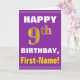 Este sencillo diseño de tarjetas de felicitación con temática de cumpleaños presenta un cálido deseo de cumpleaños como "¡FELIZ CUMPLEAÑOS, nombre!" en la parte delantera, en negrita con un fondo morado. El número de cumpleaños tiene un aspecto de color falso/imitación dorado. El nombre del frente puede ser personalizado. El interior incluye un mensaje de cumpleaños que se puede personalizar. Una tarjeta de felicitación como esta podría ser una manera divertida de entregar deseos de cumpleaños a alguien que está celebrando su noveno cumpleaños. [~Z0000277]