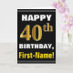 Este sencillo diseño de tarjetas de felicitación con temática de cumpleaños presenta un cálido deseo de cumpleaños como "¡FELIZ CUMPLEAÑOS, nombre!" en la parte delantera, en negrita con un fondo de color negro. El número de cumpleaños tiene un aspecto de color falso/imitación dorado. El nombre del frente puede ser personalizado. El interior incluye un mensaje de cumpleaños que se puede personalizar. Una tarjeta de felicitación como esta podría ser una manera divertida de ofrecer deseos de cumpleaños a alguien que está celebrando su cuadragésimo cumpleaños. [~Z0000275]