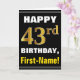 Este sencillo diseño de tarjetas de felicitación con temática de cumpleaños presenta un cálido deseo de cumpleaños como "¡FELIZ CUMPLEAÑOS, nombre!" en la parte delantera, en negrita con un fondo de color negro. El número de cumpleaños tiene un aspecto de color falso/imitación dorado. El nombre en la parte delantera se puede personalizar. El interior incluye un mensaje de cumpleaños que se puede personalizar. Una tarjeta de felicitación como esta podría ser una manera divertida de entregar deseos de cumpleaños a alguien que está celebrando su 43 cumpleaños. [~Z0000275]