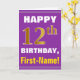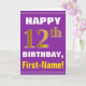 Este sencillo diseño de tarjetas de felicitación con temática de cumpleaños presenta un cálido deseo de cumpleaños como "¡FELIZ 12º CUMPLEAÑOS, nombre!" en la parte delantera, en negrita con un fondo morado. El número de cumpleaños tiene un aspecto de color falso/imitación dorado. El nombre del frente puede ser personalizado. El interior incluye un mensaje de cumpleaños de personalizable. Una tarjeta de felicitación como esta podría ser una manera divertida de entregar deseos de cumpleaños a alguien que está celebrando su duodécimo cumpleaños. [~Z0000277]