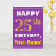 Este sencillo diseño de tarjetas de felicitación con temática de cumpleaños presenta un cálido deseo de cumpleaños como "¡FELIZ 25 cumpleaños, nombre!" en la parte delantera, en negrita con un fondo morado. El número de cumpleaños tiene un aspecto de color falso/imitación dorado. El nombre del frente puede ser personalizado. El interior incluye un mensaje de cumpleaños que se puede personalizar. Una tarjeta de felicitación como esta podría ser una manera divertida de entregar deseos de cumpleaños a alguien que está celebrando su vigésimo quinto cumpleaños. [~Z0000277]