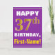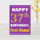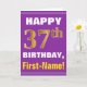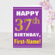 Este sencillo diseño de tarjetas de felicitación con temática de cumpleaños presenta un cálido deseo de cumpleaños como "¡FELIZ 37 cumpleaños, nombre!" en la parte delantera, en negrita con un fondo morado. El número de cumpleaños tiene un aspecto de color falso/imitación dorado. El nombre del frente puede ser personalizado. El interior incluye un mensaje de cumpleaños que se puede personalizar. Una tarjeta de felicitación como esta podría ser una manera divertida de entregar deseos de cumpleaños a alguien que está celebrando su 37 cumpleaños. [~Z0000277]