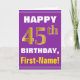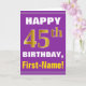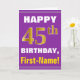 Este sencillo diseño de tarjetas de felicitación con temática de cumpleaños presenta un cálido deseo de cumpleaños como "¡FELIZ CUMPLEAÑOS 45, nombre!" en la parte delantera, en negrita con un fondo morado. El número de cumpleaños tiene un aspecto de color falso/imitación dorado. El nombre del frente puede ser personalizado. El interior incluye un mensaje de cumpleaños que se puede personalizar. Una tarjeta de felicitación como esta podría ser una manera divertida de entregar deseos de cumpleaños a alguien que está celebrando su 45 cumpleaños. [~Z0000277]
