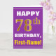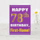 Este sencillo diseño de tarjetas de felicitación con temática de cumpleaños presenta un cálido deseo de cumpleaños como "¡FELIZ CUMPLEAÑOS 78, nombre!" en la parte delantera, en negrita con un fondo morado. El número de cumpleaños tiene un aspecto de color falso/imitación dorado. El nombre en la parte delantera se puede personalizar. El interior incluye un mensaje de cumpleaños de personalizable. Una tarjeta de felicitación como esta podría ser una manera divertida de entregar deseos de cumpleaños a alguien que está celebrando su cumpleaños setenta y ocho. [~Z0000277]
