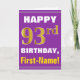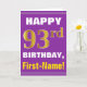 Este sencillo diseño de tarjetas de felicitación con temática de cumpleaños presenta un cálido deseo de cumpleaños como "¡FELIZ 93º CUMPLEAÑOS, nombre!" en la parte delantera, en negrita con un fondo morado. El número de cumpleaños tiene un aspecto de color falso/imitación dorado. El nombre en la parte delantera se puede personalizar. El interior incluye un mensaje de cumpleaños de personalizable. Una tarjeta de felicitación como esta podría ser una manera divertida de entregar deseos de cumpleaños a alguien que esté celebrando su noventa tercer cumpleaños. [~Z0000277]
