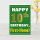 Este sencillo diseño de tarjetas de felicitación con temática de cumpleaños presenta un cálido deseo de cumpleaños como "¡FELIZ décimo cumpleaños, nombre!" en la parte delantera, en negrita con un fondo de color verde. El número de cumpleaños tiene un aspecto de color falso/imitación dorado. El nombre del frente puede ser personalizado. El interior incluye un mensaje de cumpleaños de personalizable. Una tarjeta de felicitación como esta podría ser una manera divertida de entregar deseos de cumpleaños a alguien que está celebrando su décimo cumpleaños. [~Z0000279]