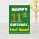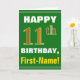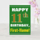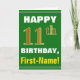Este sencillo diseño de tarjetas de felicitación con temática de cumpleaños presenta un cálido deseo de cumpleaños como "¡FELIZ 11º CUMPLEAÑOS, nombre!" en la parte delantera, en negrita con un fondo de color verde. El número de cumpleaños tiene un aspecto de color falso/imitación dorado. El nombre en la parte delantera se puede personalizar. El interior incluye un mensaje de cumpleaños de personalizable. Una tarjeta de felicitación como esta podría ser una manera divertida de entregar deseos de cumpleaños a alguien que está celebrando su undécimo cumpleaños. [~Z0000279]