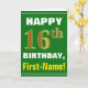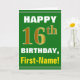 Este sencillo diseño de tarjetas de felicitación con temática de cumpleaños presenta un cálido deseo de cumpleaños como "¡FELIZ 16º CUMPLEAÑOS, nombre!" en la parte delantera, en negrita con un fondo de color verde. El número de cumpleaños tiene un aspecto de color falso/imitación dorado. El nombre del frente puede ser personalizado. El interior incluye un mensaje de cumpleaños que se puede personalizar. Una tarjeta de felicitación como esta podría ser una manera divertida de entregar deseos de cumpleaños a alguien que está celebrando su decimosexto cumpleaños. [~Z0000279]