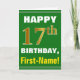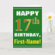 Este sencillo diseño de tarjetas de felicitación con temática de cumpleaños presenta un cálido deseo de cumpleaños como "¡FELIZ 17 cumpleaños, nombre!" en la parte delantera, en negrita con un fondo de color verde. El número de cumpleaños tiene un aspecto de color falso/imitación dorado. El nombre del frente puede ser personalizado. El interior incluye un mensaje de cumpleaños que se puede personalizar. Una tarjeta de felicitación como esta podría ser una manera divertida de entregar deseos de cumpleaños a alguien que está celebrando su decimoséptimo cumpleaños. [~Z0000279]