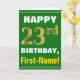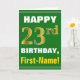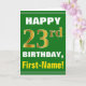 Este sencillo diseño de tarjetas de felicitación con temática de cumpleaños presenta un cálido deseo de cumpleaños como "¡FELIZ 23 cumpleaños, nombre!" en la parte delantera, en negrita con un fondo de color verde. El número de cumpleaños tiene un aspecto de color falso/imitación dorado. El nombre del frente puede ser personalizado. El interior incluye un mensaje de cumpleaños que se puede personalizar. Una tarjeta de felicitación como esta podría ser una manera divertida de dar deseos de cumpleaños a alguien que está celebrando su vigésimo tercer cumpleaños. [~Z0000279]