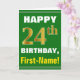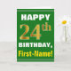 Este sencillo diseño de tarjetas de felicitación con temática de cumpleaños presenta un cálido deseo de cumpleaños como "¡FELIZ cumpleaños 24, nombre!" en la parte delantera, en negrita con un fondo de color verde. El número de cumpleaños tiene un aspecto de color falso/imitación dorado. El nombre del frente puede ser personalizado. El interior incluye un mensaje de cumpleaños que se puede personalizar. Una tarjeta de felicitación como esta podría ser una manera divertida de enviar deseos de cumpleaños a alguien que está celebrando su vigésimo cuarto cumpleaños. [~Z0000279]