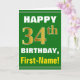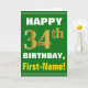 Este sencillo diseño de tarjetas de felicitación con temática de cumpleaños presenta un cálido deseo de cumpleaños como "¡FELIZ 34º CUMPLEAÑOS, nombre!" en la parte delantera, en negrita con un fondo de color verde. El número de cumpleaños tiene un aspecto de color falso/imitación dorado. El nombre en la parte delantera se puede personalizar. El interior incluye un mensaje de cumpleaños que se puede personalizar. Una tarjeta de felicitación como esta podría ser una manera divertida de entregar deseos de cumpleaños a alguien que está celebrando su 34 cumpleaños. [~Z0000279]