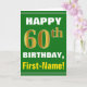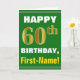 Este sencillo diseño de tarjetas de felicitación con temática de cumpleaños presenta un cálido deseo de cumpleaños como "¡FELIZ 60 cumpleaños, nombre!" en la parte delantera, en negrita con un fondo de color verde. El número de cumpleaños tiene un aspecto de color falso/imitación dorado. El nombre del frente puede ser personalizado. El interior incluye un mensaje de cumpleaños que se puede personalizar. Una tarjeta de felicitación como esta podría ser una manera divertida de entregar deseos de cumpleaños a alguien que está celebrando su sexagésimo cumpleaños. [~Z0000279]