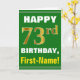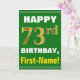 Este sencillo diseño de tarjetas de felicitación con temática de cumpleaños presenta un cálido deseo de cumpleaños como "¡FELIZ CUMPLEAÑOS 73, nombre!" en la parte delantera, en negrita con un fondo de color verde. El número de cumpleaños tiene un aspecto de color falso/imitación dorado. El nombre en la parte delantera se puede personalizar. El interior incluye un mensaje de cumpleaños que se puede personalizar. Una tarjeta de felicitación como esta podría ser una manera divertida de entregar deseos de cumpleaños a alguien que está celebrando su cumpleaños setenta y tres. [~Z0000279]