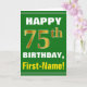 Este sencillo diseño de tarjetas de felicitación con temática de cumpleaños presenta un cálido deseo de cumpleaños como "¡FELIZ CUMPLEAÑOS 75, nombre!" en la parte delantera, en negrita con un fondo de color verde. El número de cumpleaños tiene un aspecto de color falso/imitación dorado. El nombre en la parte delantera se puede personalizar. El interior incluye un mensaje de cumpleaños que se puede personalizar. Una tarjeta de felicitación como esta podría ser una manera divertida de entregar deseos de cumpleaños a alguien que está celebrando su cumpleaños setenta y cinco. [~Z0000279]