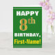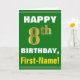 Este sencillo diseño de tarjetas de felicitación con temática de cumpleaños presenta un cálido deseo de cumpleaños como "¡FELIZ CUMPLEAÑOS, nombre!" en la parte delantera, en negrita con un fondo de color verde. El número de cumpleaños tiene un aspecto de color falso/imitación dorado. El nombre en la parte delantera se puede personalizar. El interior incluye un mensaje de cumpleaños de personalizable. Una tarjeta de felicitación como esta podría ser una manera divertida de entregar deseos de cumpleaños a alguien que está celebrando su octavo cumpleaños. [~Z0000279]