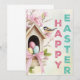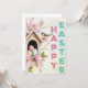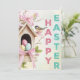 A cozy wooden birdhouse filled with speckled eggs and framed by blooming pink flowers and a perched bird. With bold vertical "HAPPY EASTER" text, this card radiates springtime warmth and celebration.