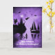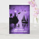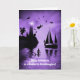 Una tarjeta de Halloween con temática náutica. Brujas y cuervos, sirenas y jinetes sin cabeza, con velero y faro. ¡Añade un par de piedras en la cabeza, gatos negros y un búho! Una tarjeta costera muy divertida, oceánica, de tipo balneario de Halloween. Solo por tu nieta o puedes cambiar la relación.