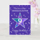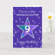 ¡Que tu nieta se sienta especial en su noveno cumpleaños con este alegre y colorido diseño! Una gran estrella acuática, que brilla en una mezcla de violetas, azules, rosas y verdes, ocupa el centro del escenario en un marco caprichoso. Estrellas más pequeñas con textura se tambalean por todas partes, lo que aumenta la diversión. Una manera alegre y cariñosa de decir, "¡Eres una estrella hoy y todos los días!"