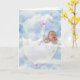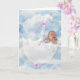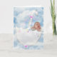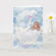 Niña con paraguas blanco flotando en el cielo para felicitaciones a los padres