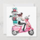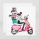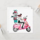 Una niña montando un scooter rosa llevando muchos regalos de Navidad.