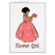 Esta es una preciosa imagen de una niña florida con un vestido de coral con estrellas blancas llevando un pequeño ramo de flores.