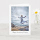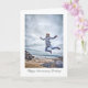 Una tarjeta de felicitación que presenta a una mujer saltando de alegría desde unas rocas en una playa. Sus brazos y piernas están parcialmente estirados, convirtiéndolo en un salto de cangrejo. Lleva una chaqueta acolchada contra el frío y su cabello se levanta con el viento. Con una expresión feliz y ojos bien abiertos, la impresión general es de exuberancia salvaje.