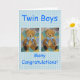 Dos lindos y pequeños teddies con arcos azules sobre fondo gingham y el texto Twin Boys Many Felicitaciones!