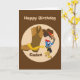 Una linda tarjeta personalizada de cumpleaños de vaquero que presenta a un niño de la granja apoyándose en una bota gigante de vaquero timando a su gorra marrón con una estrella amarilla. Un gran regalo de país personalizado con su nombre.