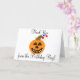 Cute Halloween Sonriente Calabaza con globos coloridos es perfecto para enviar tarjetas de agradecimiento por cumpleaños al niño de primer cumpleaños por cualquier cumpleaños de edad! Deja el mensaje dentro de la tarjeta de felicitación o personaliza con la tuya propia. Visita mi tienda para ver las invitaciones de cumpleaños iniciales. Pintura gráfica original y diseños © TamiraZDesigns.