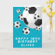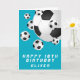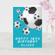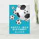 Tarjeta de cumpleaños feliz para niños de niños de la pelota de fútbol verde azulada. Personalice su nombre y haga una tarjeta de felicitación de cumpleaños para un futbolista o hincha de fútbol.