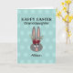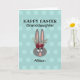 Haga su día con esta tarjeta de nombre de conejo conejo conejo de pascua. Es moderno y está decorado con un fondo verde azulado pastel de personalizable y un conejito gris adorable con orejas altas y flores de color burdeos. El texto es "Nieta feliz de Pascua" y su nombre en la tarjeta. El fondo tiene un patrón de puntos de polka verde azulado más claro. La tarjeta interior tiene un sencillo saludo de personalizable y el nombre "de" su firma. Haga clic en la opción personalizar plantilla y siga las instrucciones.