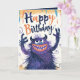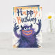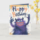 Esta es una tarjeta de cumpleaños de ilustración de arte de un monstruo azul y púrpura para amantes de los monstruos. Dentro de la tarjeta, puedes personalizarla con la foto de un niño, nombre y edad.