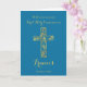 Elegante tarjeta plegada para la primera comunión sagrada con una cruz dorada sobre un fondo azul. Personalizar delante con texto, nombre y fecha...dentro con verso biblia y texto.