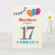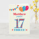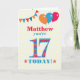 Una tarjeta de cumpleaños colorida para un joven de 17 años para que la personalices con un nombre. El gran número 17 está lleno de un patrón naranja, rojo y azul, delineado en azul brillante. Hay globos y banderines en la parte superior, en colores coincidentes y el saludo de la portada es '(Nombre aquí), ¡hoy cumples 17!', en letras rojas y azules brillantes, sobre un fondo muy pálido amarillo y blanco con lunares, con estrellas rojas y naranjas a cada lado de la palabra '¡HOY!'. El mensaje interior se puede personalizar o eliminar fácilmente si lo deseas.