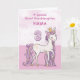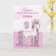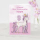 Esta linda tarjeta traerá un oh y un ah a tu bisnieta en su tercer cumpleaños cuando vea este pony rosa y blanco que lleva una corona con un toque de brillo dorado en su crin, cola y corona. Dulce tarjeta para desear a tu bisnieta un feliz tercer cumpleaños. Personaliza esta tarjeta con el nombre de tu bisnieta.