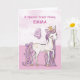 Un pony rosa dulce como tu sobrina mayor está bailando con el número cuatro. Los detalles dorados están tejidos en su crin y cola. Tarjeta perfecta para desearle un feliz cumpleaños a tu sobrina. Personaliza con el nombre de tu sobrina.