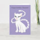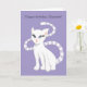 Tarjeta de cumpleaños personalizada para gatos blancos con un ilustracion vectorial que representa a una bella gatita femenina con los ojos azules sentados y sonriendo sobre fondo violeta y nombre de personalizable. Este lindo animal tiene una divertida cola rayada en franjas blancas y violetas. Este diseño felino es genial para una chica que tiene y ama su gatito blanco y para los amantes del gato como yo.
