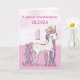 Un dulce poni rosa como su nieta está trotando con el número uno. Los detalles dorados están entretejidos en su crin y cola. Tarjeta perfecta para desearle a su nieta su 1 cumpleaños. Puede personalizar el nombre en esta tarjeta.