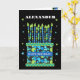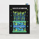 Una tarjeta de cumpleaños brillante para ti al personalizar, con muchas velas estampadas en una torta de cumpleaños. En la parte superior de la portada, hay mucho espacio para que escriba el nombre del destinatario con letras blancas en el fondo negro. Hay una banda azul alrededor del pastel con "¡FELIZ CUMPLEAÑOS!" también en blanco. Pequeñas estrellas azules, verdes y blancas se reparten alrededor del fondo negro y el verso interior es una sugerencia que se puede cambiar o borrar fácilmente si se desea.