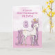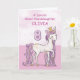 Un dulce poni rosa como tu tataranieta está brincando con el número ocho. Los detalles dorados están tejidos en su crin y cola. Tarjeta perfecta para desearle a tu tataranieta su octavo cumpleaños. Personaliza esta tarjeta con el nombre de tu tataranieta.