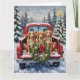 Celebrate the holiday season with this energetic and beautiful Nova Scotia Duck Tolling Retriever Christmas design! This cheerful scene features three bright, reddish-gold Tollers sitting happily in the back of a classic red pickup truck, nestled in a picturesque snowy winter forest. The vintage truck is adorned with a vibrant Christmas wreath, twinkling with red and gold ornaments and warm, glowing lights. Soft snowflakes gently fall, enhancing the winter wonderland effect. A decorated Christmas tree in the background completes this heartwarming picture, making it an ideal Christmas gift for any Toller owner, dog lover, or admirer of festive and active dog breeds. This design perfectly captures the joyful spirit of the holidays.