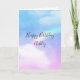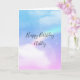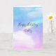 Tarjeta de felicitación con una imagen de fondo suave y encantadora. Nubes azules y rosadas pastel con un arcoíris mágico.