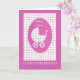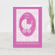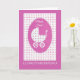 Una tarjeta bonita de la enhorabuena para un chica de recién nacido, con el saludo en Galés, y un cochecito de niño o un cochecito pasado de moda en un fondo rosado y blanco del lunar; de un collage de papel pintado a mano de Judy Adamson.