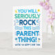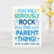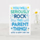 Felicite a los futuros padres con esta divertida tarjeta de diseño de tipografía colorida que presenta el mensaje "¡Seriamente vas a ROCKear esta cosa de ser padres! ¡Estamos muy felices por ti!". La tipografía está acentuada con ilustraciones de objetos para bebés pintadas con acuarela, notas musicales, estrellas y sonrisas. El interior tiene este mensaje, pero se puede personalizar con tu propio mensaje.