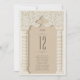 En la recepción de su boda podrá fijar un tono de lo más normal con esta lujosa tarjeta de números de mesa, inspirada en el intrincado arte del diseño árabe. La tarjeta muestra un arco de marfil elaborado con patrones giratorios que recuerdan al arte tradicional de Medio Oriente, ambientado con un rico lienzo de taupe. La atracción principal, un gran número de tabla, se muestra en un tipo de letra de expreso profundo que es a la vez audaz y elegante. El arco se funde con dos columnas clásicas adornadas con un patrón de arenque óseo en tonos marfil y beige, lo que ofrece un sutil contraste con el fondo suave del taupe. Esta tarjeta no sólo sirve como guía práctica para los clientes, sino también como una obra de arte que enriquece el entorno de la mesa con su belleza cultural y su combinación de colores neutros.